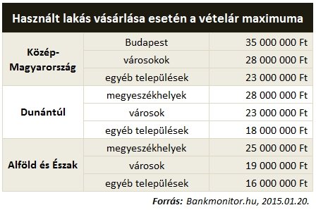 Fontos feltétele a támogatás igénylésének az ingatlan cél: lakás vásárlás, ház építés, bővítés. Használt lakás vásárlásakor a maximális vételár is meg van határozva az alábbi táblázat szerint:
